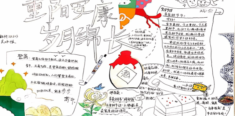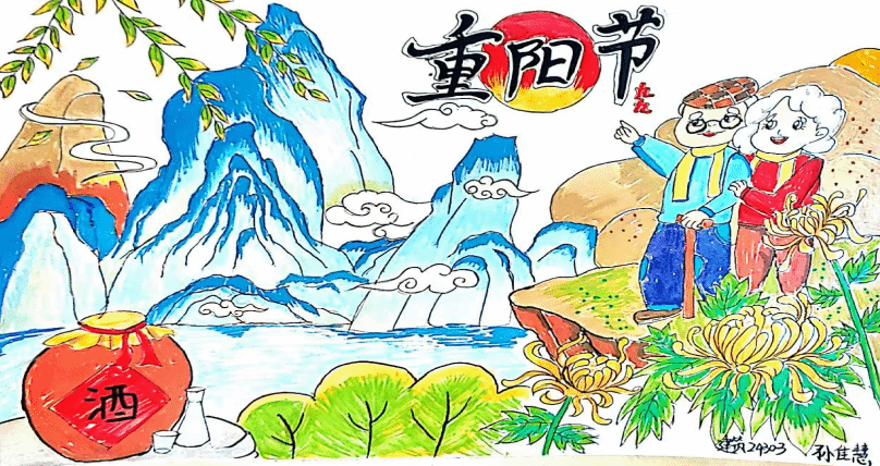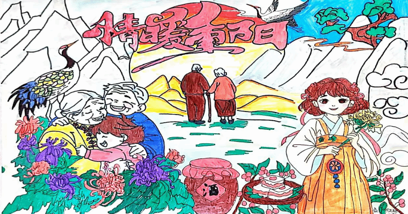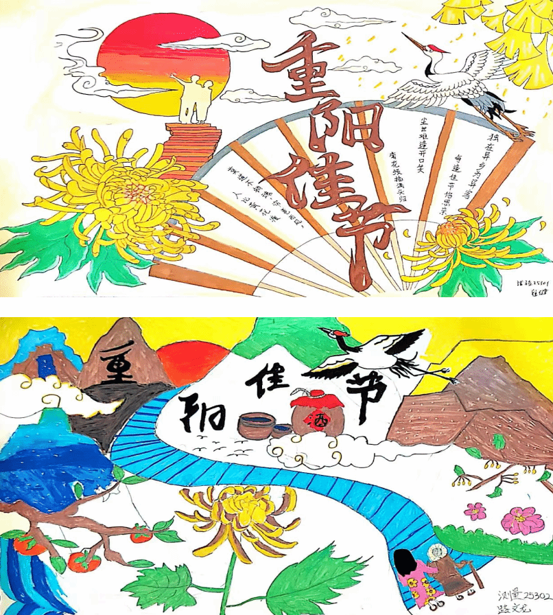比赛启动后,全院学子积极响应、踊跃参加;以画传情,诉说敬老心意,充分彰显了对传统节日的真挚礼赞与艺术诠释。一画一乾坤,一笔一真心,每一幅作品都凝聚着创作者的赤诚与心血,每一抹色彩都饱含着对重阳的理解、对亲情的眷恋。接下来,就让我们伴着秋日雅韵、怀着尊崇之意,一同踏入这笔墨描绘的重阳秘境。