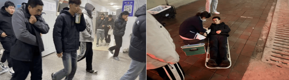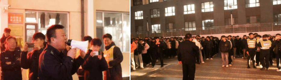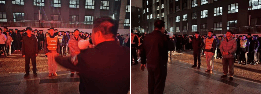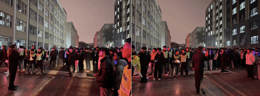 随着急促的消防警报声突然响起,演练正式启动。代云飞老师,刘振博老师,荀阔老师迅速组织学生用手或袖口捂住口鼻,弯腰低姿,按照预定疏散路线,快速、有序地向操场安全区域撤离。途中,同学们听从指挥、不推不挤,避开拐角和障碍物,展现出良好的应急素养。与此同时,学生公寓安保人员迅速切断电源,模拟初期火情处置。短短几分钟内同学们全部安全疏散至指定区域,各班班长立即清点人数并上报,确保无一人遗漏。