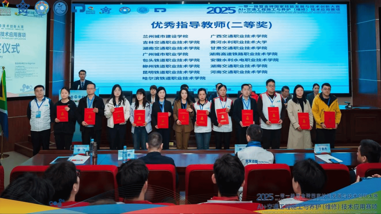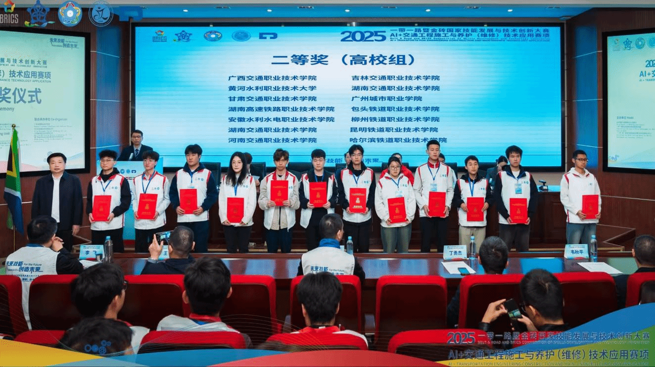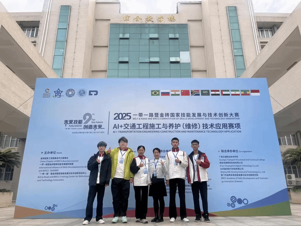 12月5日至12月7日,2025一带一路暨金砖国家技能发展与技术创新大赛之 AI+交通工程施工与养护(维修)技术应用赛项全国总决赛于广西交通职业技术学院成功举办。来自全国25个省份的参赛选手同台竞技,经过激烈精彩的角逐,由道桥工程学院学生王熙俊、李佳博组成的吉林交通职业技术学院1队(郭梅、杨晓艳老师指导)荣获高校组二等奖,柴玉龙、郭天昊组成的吉林交通职业技术学院2队(王丹妮、杨晓艳老师指导)荣获三等奖,指导教师郭梅、杨晓艳荣获优秀指导教师荣誉称号。教师郭梅凭借扎实功底,在职工组中获得二等奖。
