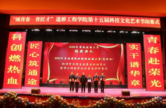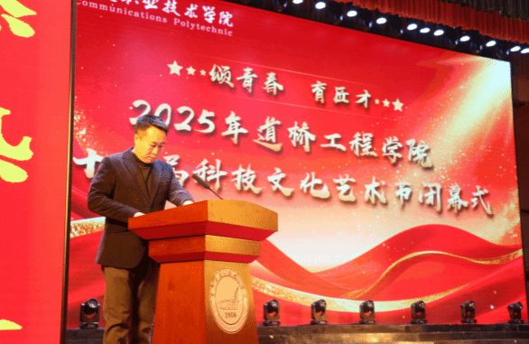 2025年12月26日,道桥工程学院“颂青春 育匠才”第十五届科技文化艺术节闭幕式在大学生活动中心隆重举行。吉林交通职业技术学院党委副书记赵剑辉、副院长马凯、副院长孟凡成、副院长方健、吉林云信空间科技有限公司董事长禹东彬、教务处处长陈立春、校团委书记李彦鑫、学生工作处处长李铁波、交通信息学院党总支书记李月姝、航空学院党总支副书记卢颖、道桥工程学院党总支书记周勇、院长魏斌、副院长李杨、党总支副书记石春辉及学院师生代表共同出席了本次活动。