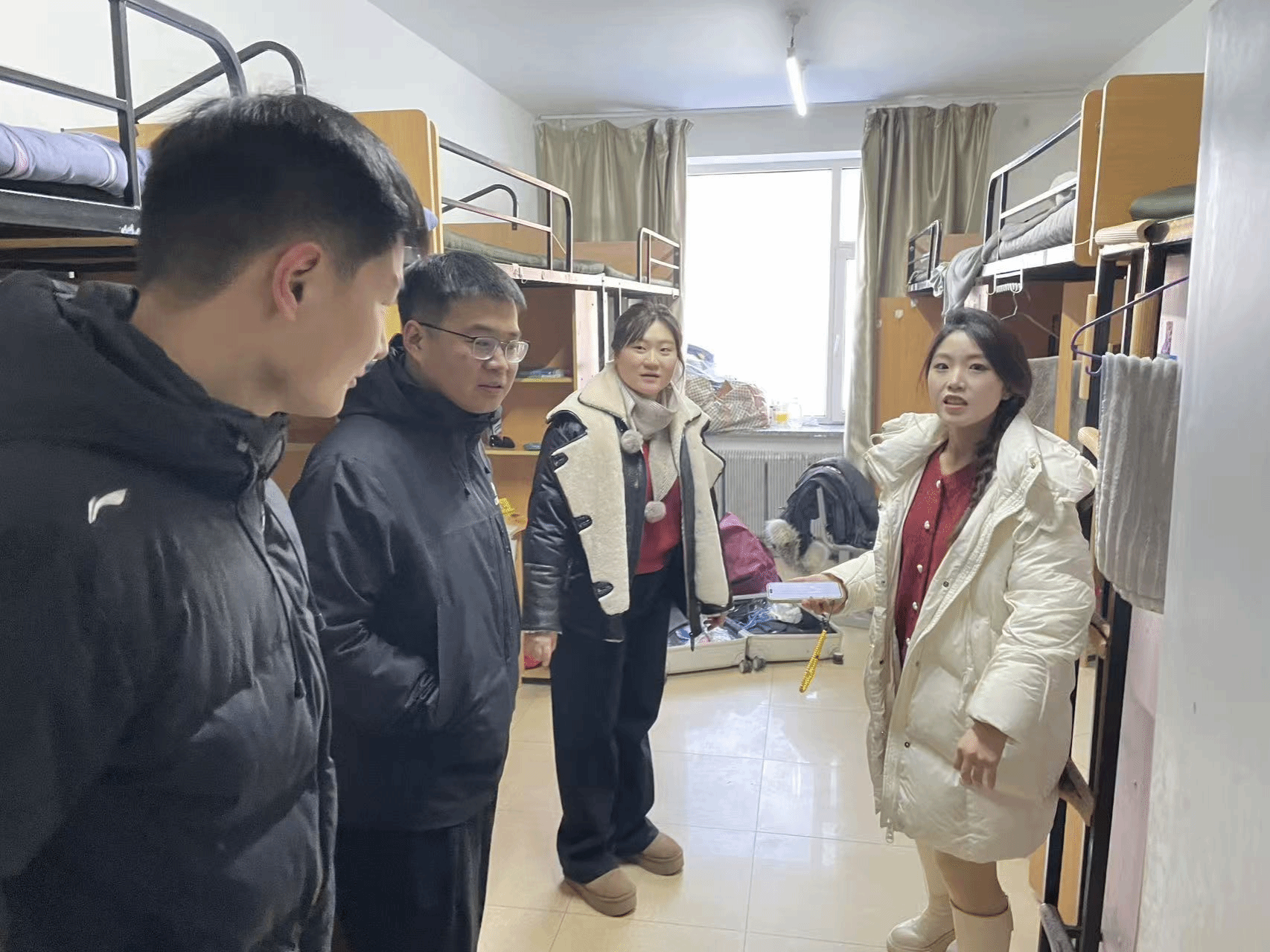 石春辉副书记与同学们亲切交流,了解大家的离校安排与假期计划,并反复叮嘱离校注意事项:一是整理好个人物品,贵重物品务必随身携带或妥善保管;二是离开宿舍前确保所有电源关闭,拔掉插头,消除火灾隐患;三是锁好门窗,做好防盗措施;四是合理安排假期,注意出行安全,保持通讯畅通。