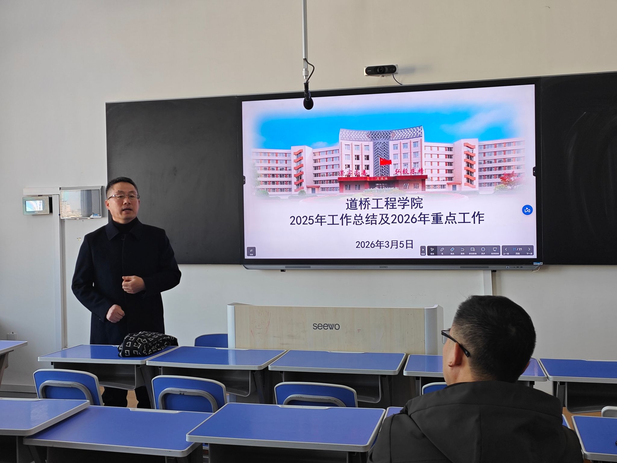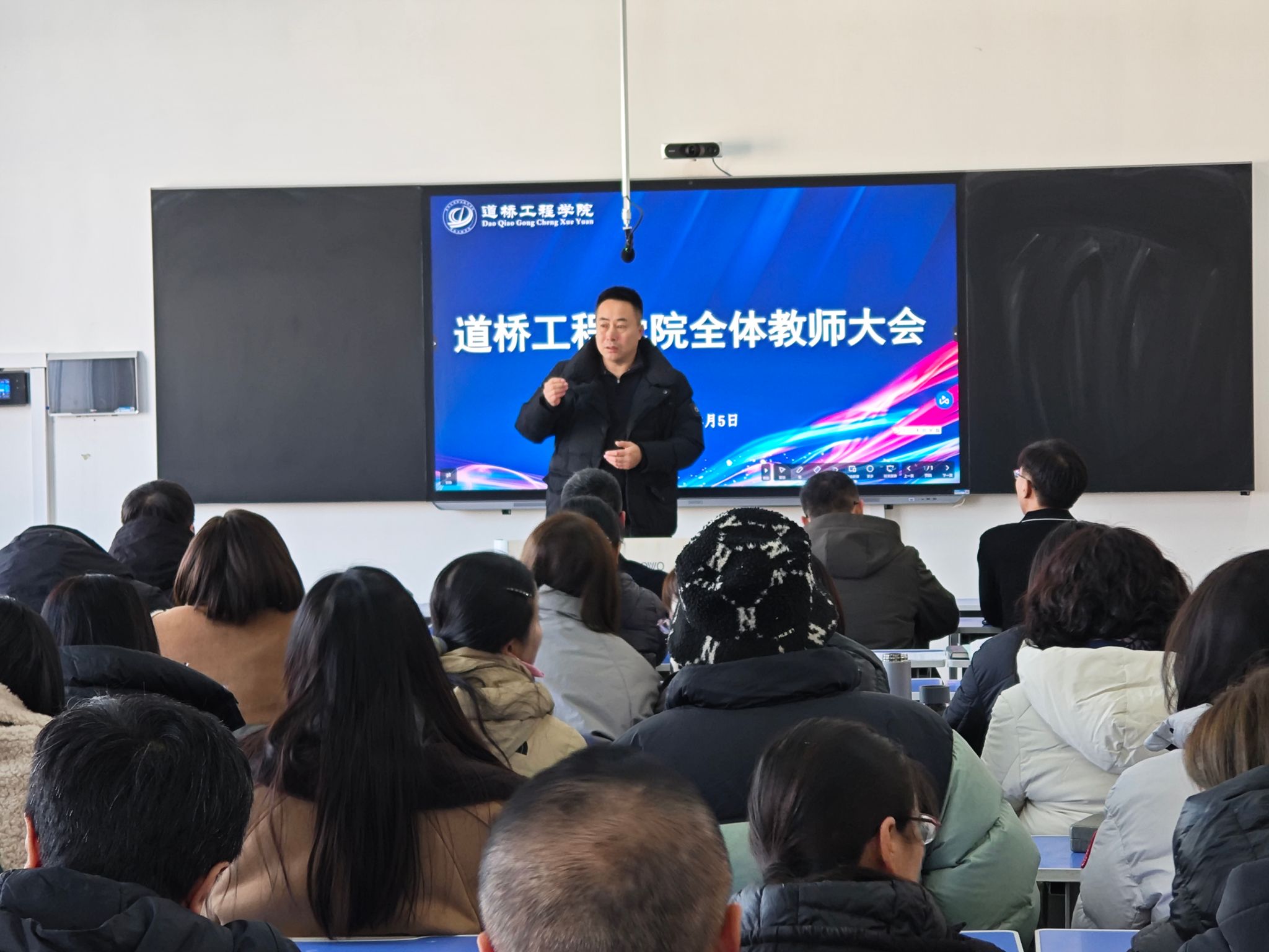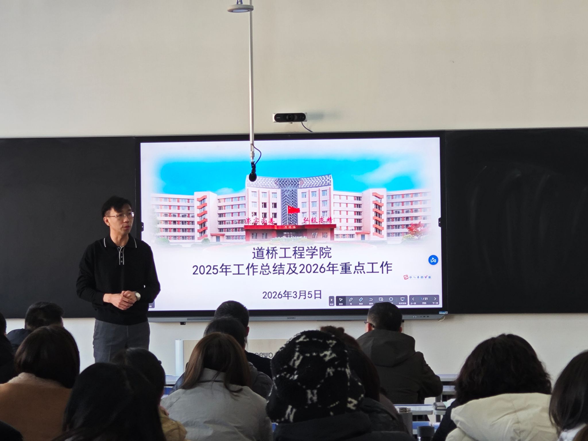 魏斌院长从专业建设、教学改革、专业竞赛、科研技术服务、招生就业、学团工作六个方面,全面总结了我院 2025 年工作成绩。专业建设成果丰硕,道路与桥梁工程技术专业群立项吉林省特色高水平专业群,获批省级现代职教体系建设重点项目2项,入选国家规划教材1部,获评吉林省“双带头人”教师党支部书记工作室1个,1名教师获得省级优秀教师荣誉称号;在吉林省职业院校技能大赛教学能力比赛中获一等奖2项、二等奖1项;教师参加技能竞赛获国家级二等奖2项、省级三等奖1项;学生竞赛斩获国家级14项、省级35项奖项,实现教育部主赛道金牌零的突破;学院党总支、班级、师生在长春市高校“文明杯”评选中获评多项先进。