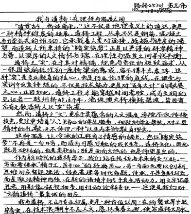 活动启动后,全院学子积极响应、踊跃参与。参赛学子们以笔为犁、以墨为种,将自己与道桥学院的独家记忆、成长感悟、青春理想诉诸笔端,在一字一句中诉说对学院的热爱,在一笔一画间传递道桥学子的精神风貌,用文字为道桥文脉注入了鲜活的青春力量。