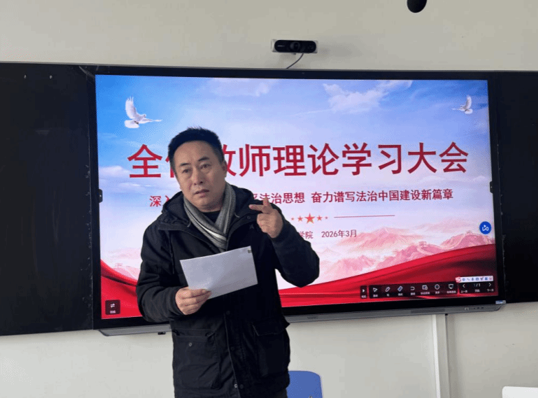 3月26日下午,学院全体教师在知行楼4406开展《习近平法治思想》专题学习。周勇带领全体教师深入解读核心要义,重点阐释“坚持依法治国和依规治党有机统一”的内涵,要求将法治思维融入教学、管理全过程,推动习近平法治思想入脑入心,提升育人质量与治理水平,实现全员覆盖、一体推进、落地见效。