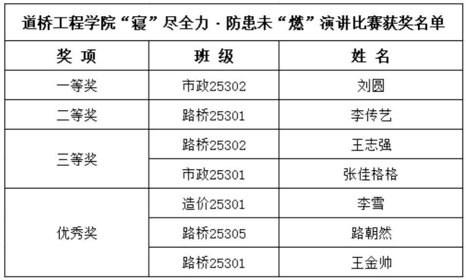 此次演讲比赛不仅为学子们搭建了展示自我的平台,更让安全理念通过生动的演讲形式深入人心。未来,道桥工程学院将持续聚焦学生寝室安全核心需求,结合公寓文化建设规划,策划开展更多实用且富有趣味性的安全主题活动,推动形成“人人讲安全、事事为安全、时时想安全”的良好氛围,与同学们携手筑牢校园安全屏障,共同守护寝室“小家”的平安与温馨!