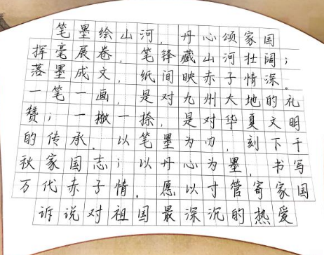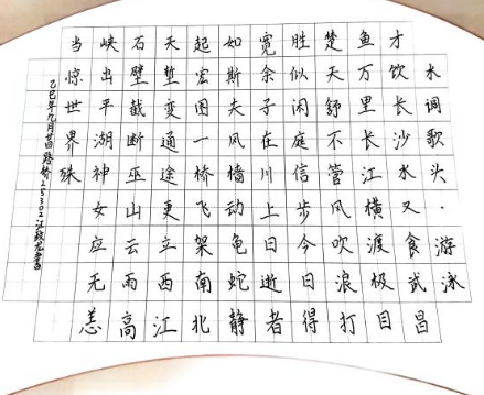 比赛现场,同学们凝神静气、挥毫泼墨,将中华经典古诗与家国情怀佳句落于尺素之间,在笔墨流转中沉浸式感受传统文化的深厚魅力,更巧妙融合道桥专业特色,让专业理想与报国热忱在纸间凝聚成生动的文化印记。接下来,小编邀您共赏字里行间的山河之美与报国之志!