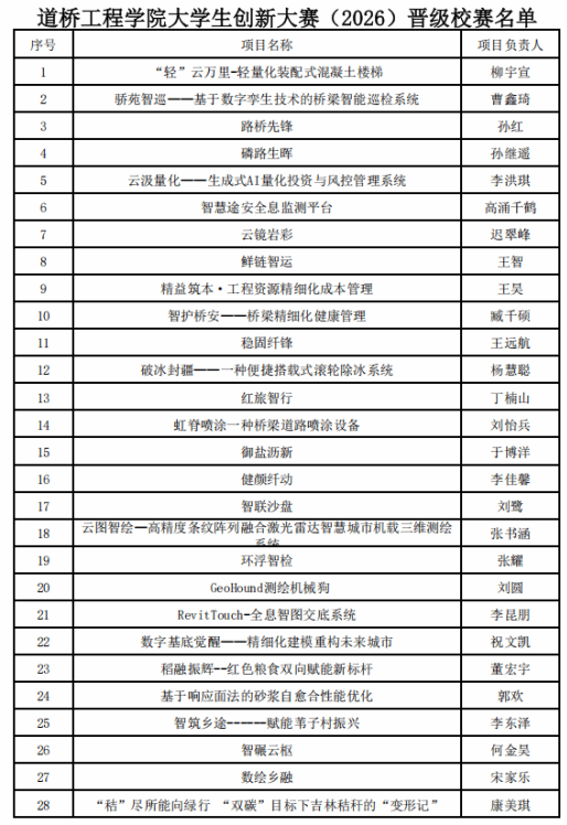 此次创新大赛院级选拔赛,是道桥工程学院深化产教融合、推进“岗课赛证”融合育人的重要实践,不仅为学子们提供了切磋技艺、提升能力的宝贵机会,更激发了全院学生的创新创业热情。道桥工程学院将以此次赛事为契机,持续完善创新创业人才培养体系,加强对优秀项目的跟踪培育,为交通强国建设输送更多具备创新精神与实践能力的高素质技术技能人才。